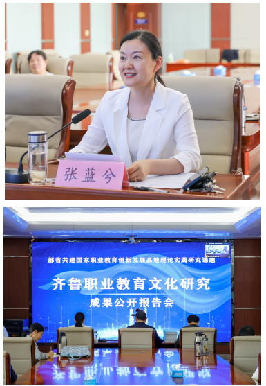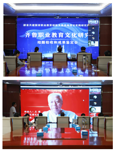 《齊魯職業(yè)教育文化研究》項目是由棗莊職業(yè)學院牽頭,聯(lián)合天津職業(yè)技術師范大學、威海海洋職業(yè)學院共同完成。此次會議采取線上線下結合的方式召開,分為成果公開報告會、結題驗收和成果鑒定會兩個階段進行。副院長張藍兮主持會議。